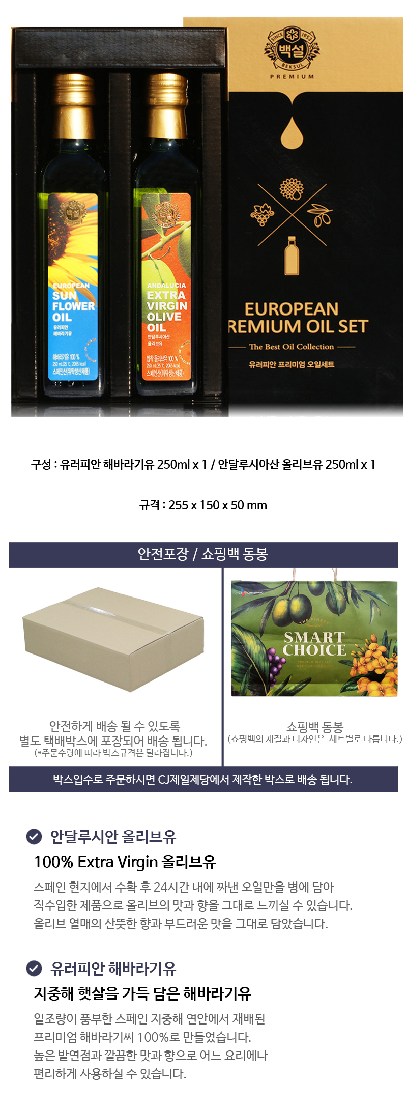 | 포장단위별 수량 | 유러피안 해바라기유 250ml x 1 / 안달루시아산 올리브유 250ml x 1 |